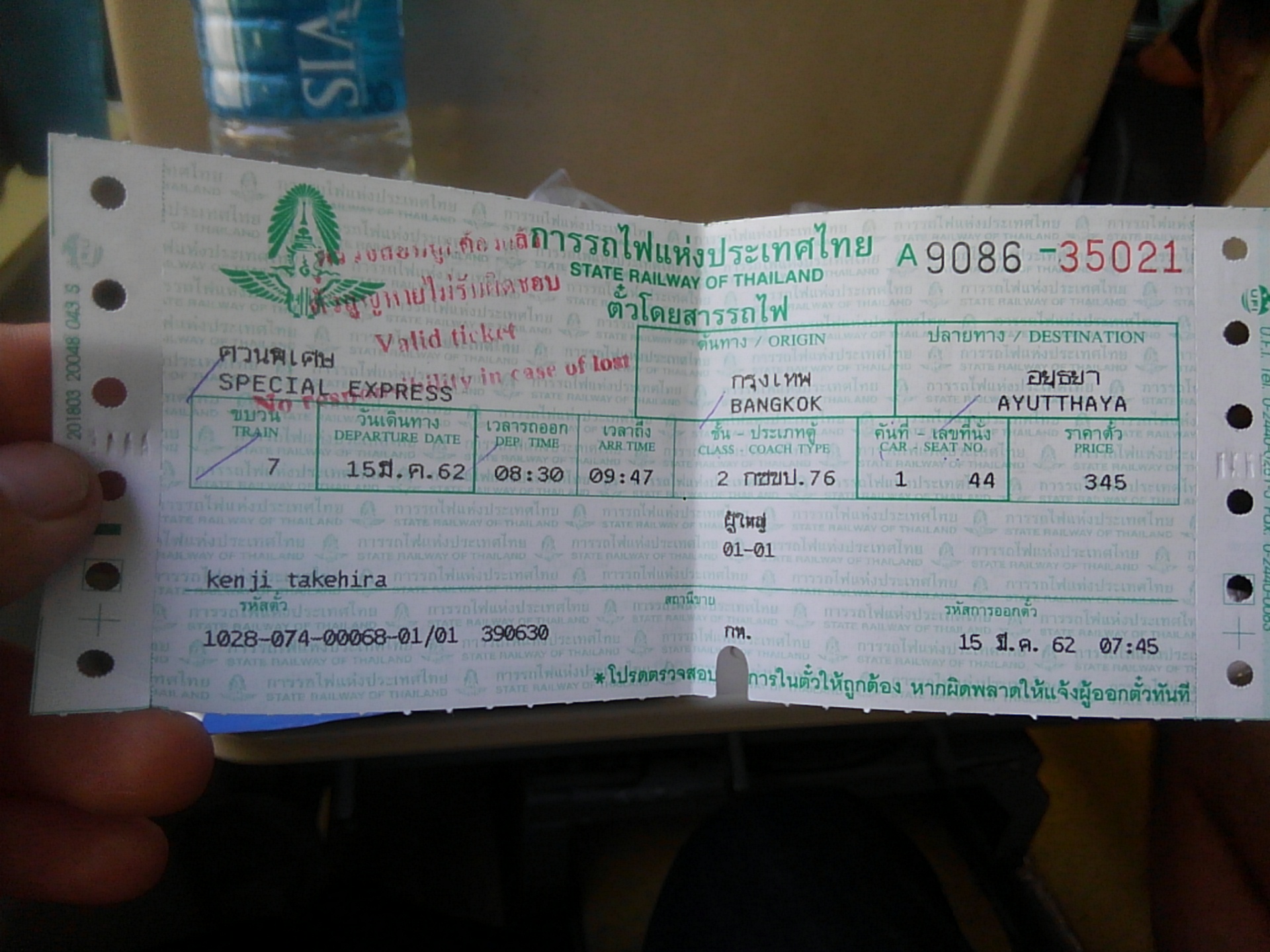 「2等席(エアコン有):345バーツ」(1,200円ぐらい)